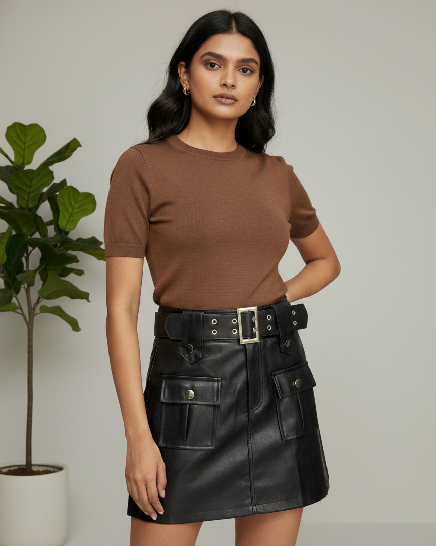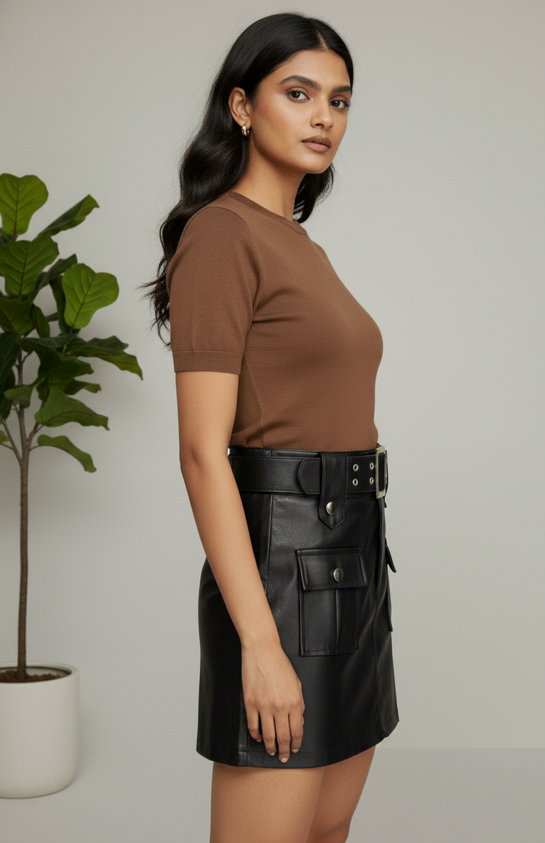 Introducing the Black Faux Leather Utility Skort, where bold fashion meets practical comfort. Made from high-quality leather-finish fabric, this skort gives the sleek look of a mini leather skirt while offering the ease of built-in inner shorts. Styled with a statement belt, metallic details, and twin utility pockets, it adds instant edge to any outfit. Perfect for night-outs, streetwear looks, or elevated casual styling.