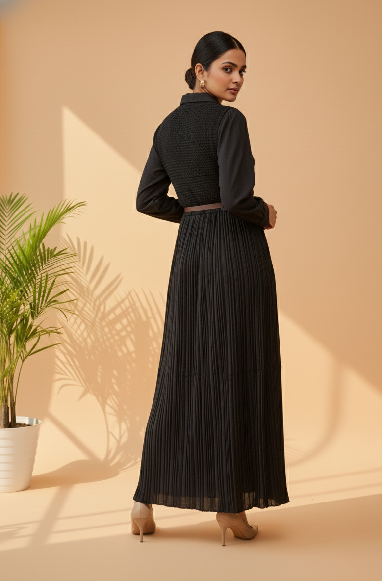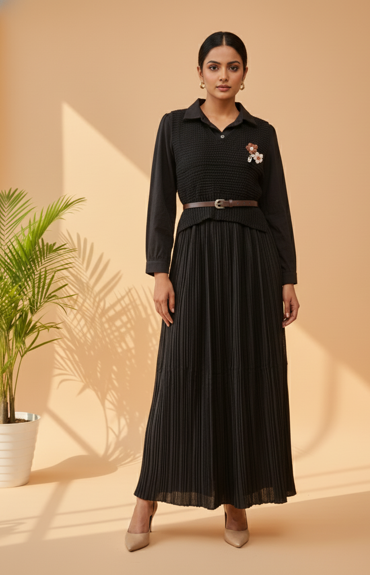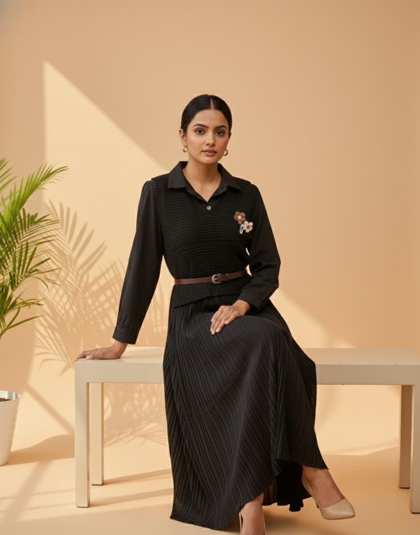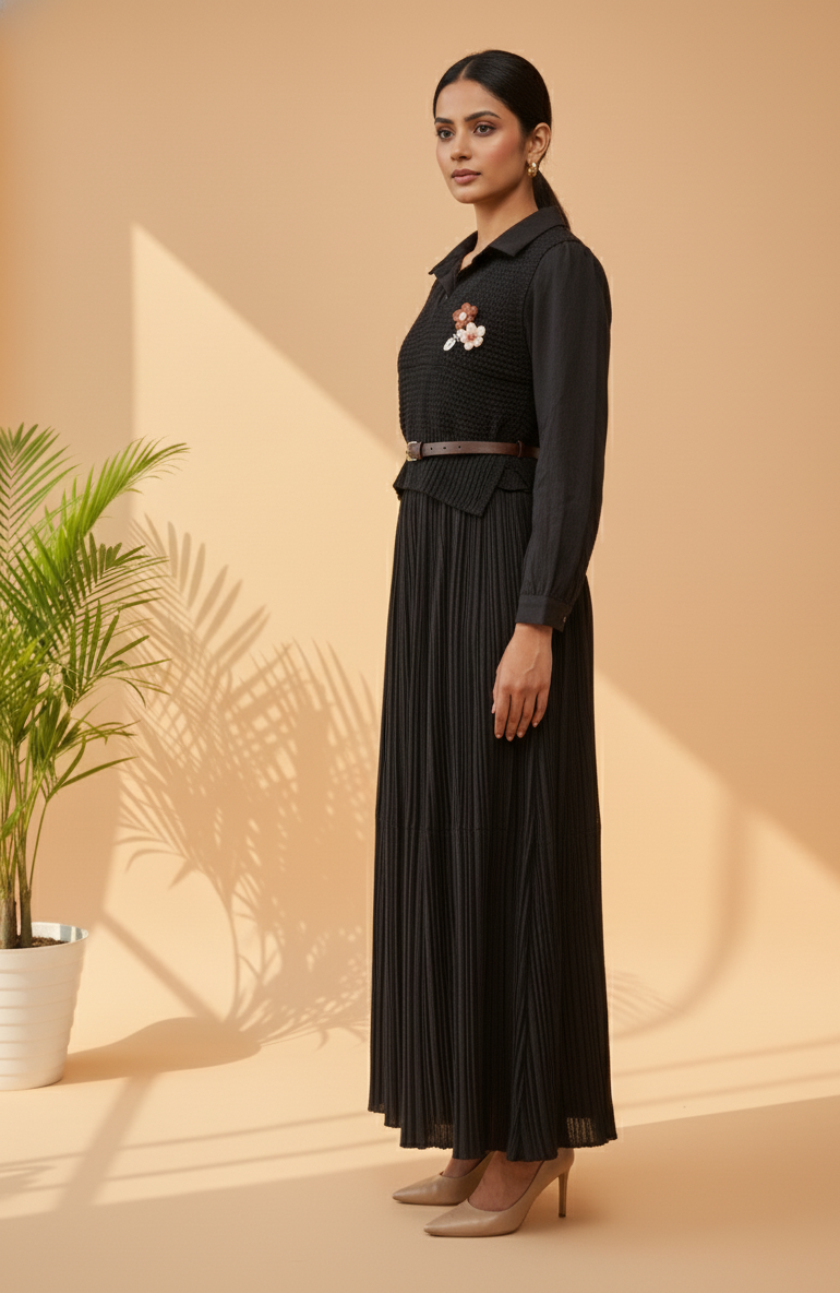 FABRIC: Knitted & Pleated Polyester Blend FABRIC COLOR 1: Classic Black CLOSURE: Zipper POCKETS: No FABRIC TYPE : Pleated SLEEVE LENGTH: Full Sleeve FIT: True To Size EXTRA DETAILS: Comes with a floral brooch accent for a feminine finish DELIVERY TIME: 3-7 Days WASH CARE: Dry Clean Only