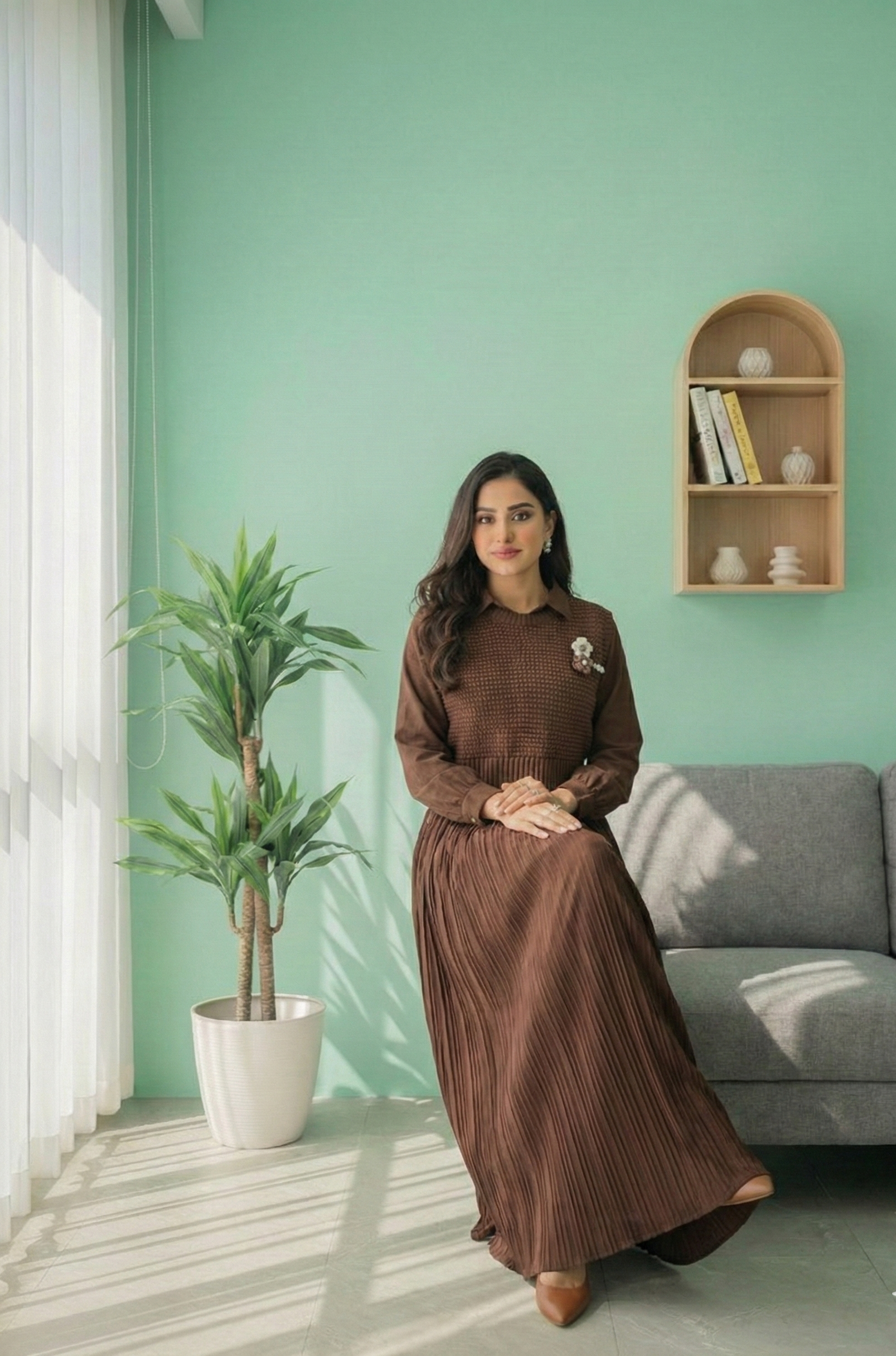 Step into timeless elegance with this chocolate brown pleated winter dress by Donne Tenaci. Designed with a structured twill shirt base layered under a textured knit V-neck overlay, it offers both warmth and sophistication. The pleated dress flows beautifully, adding movement and grace, while a floral brooch detail adds a soft, feminine touch. Perfect for cozy brunches, office days, or chic evenings out.