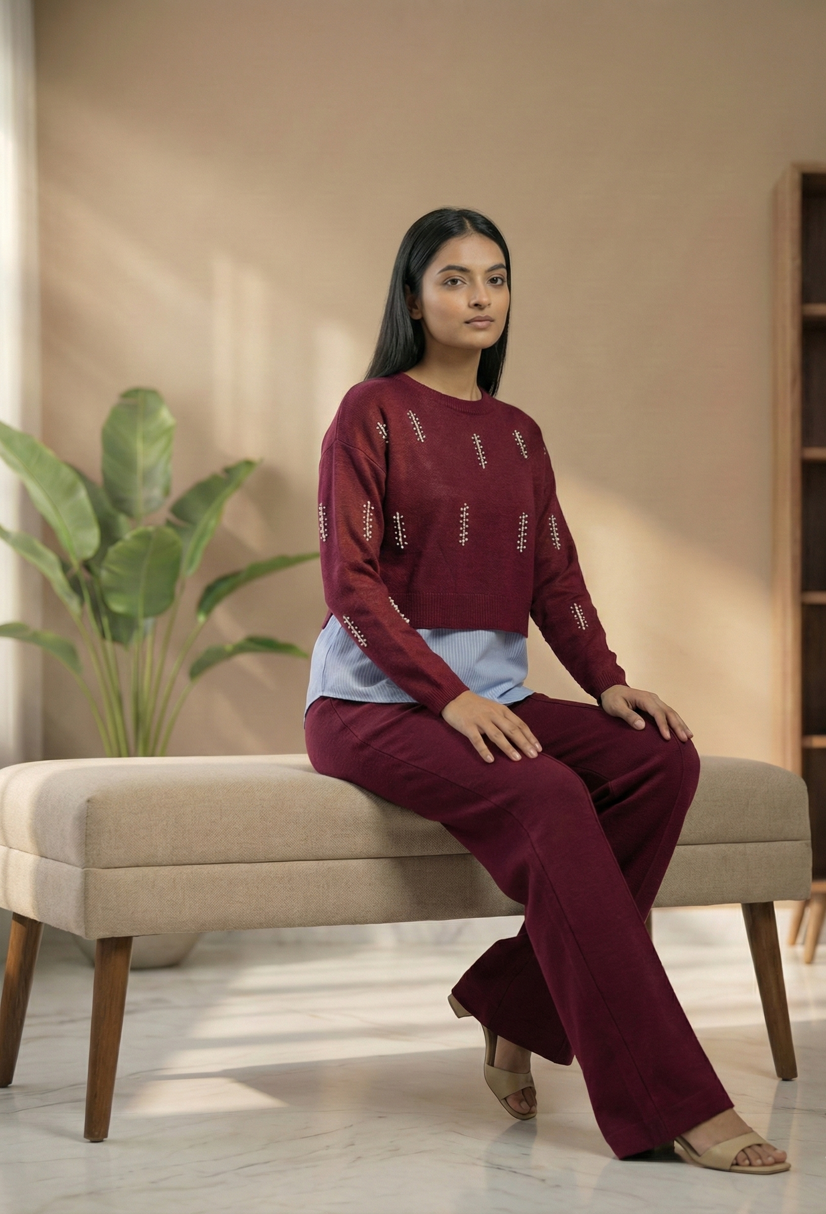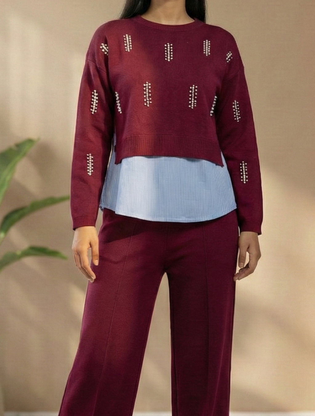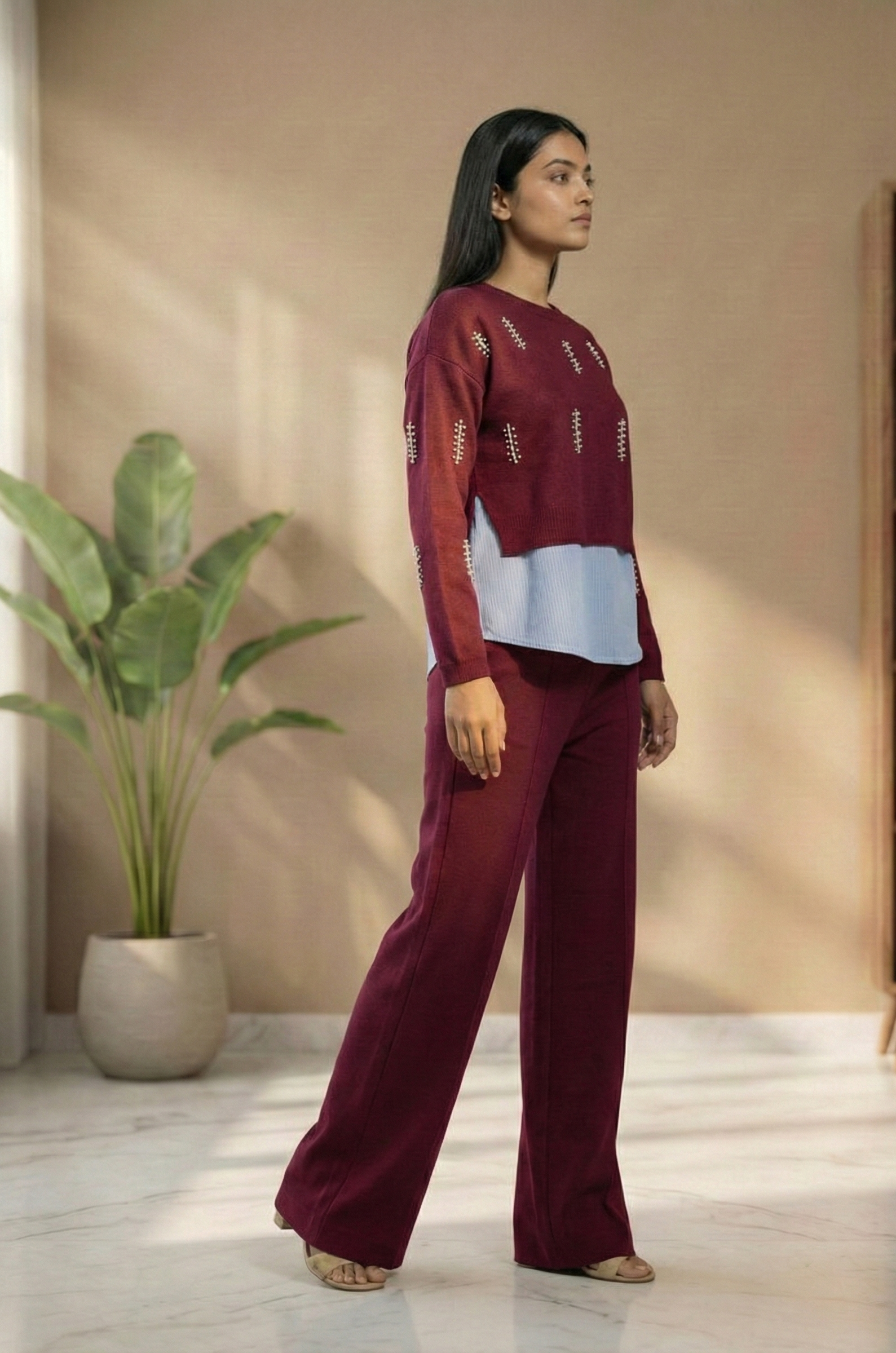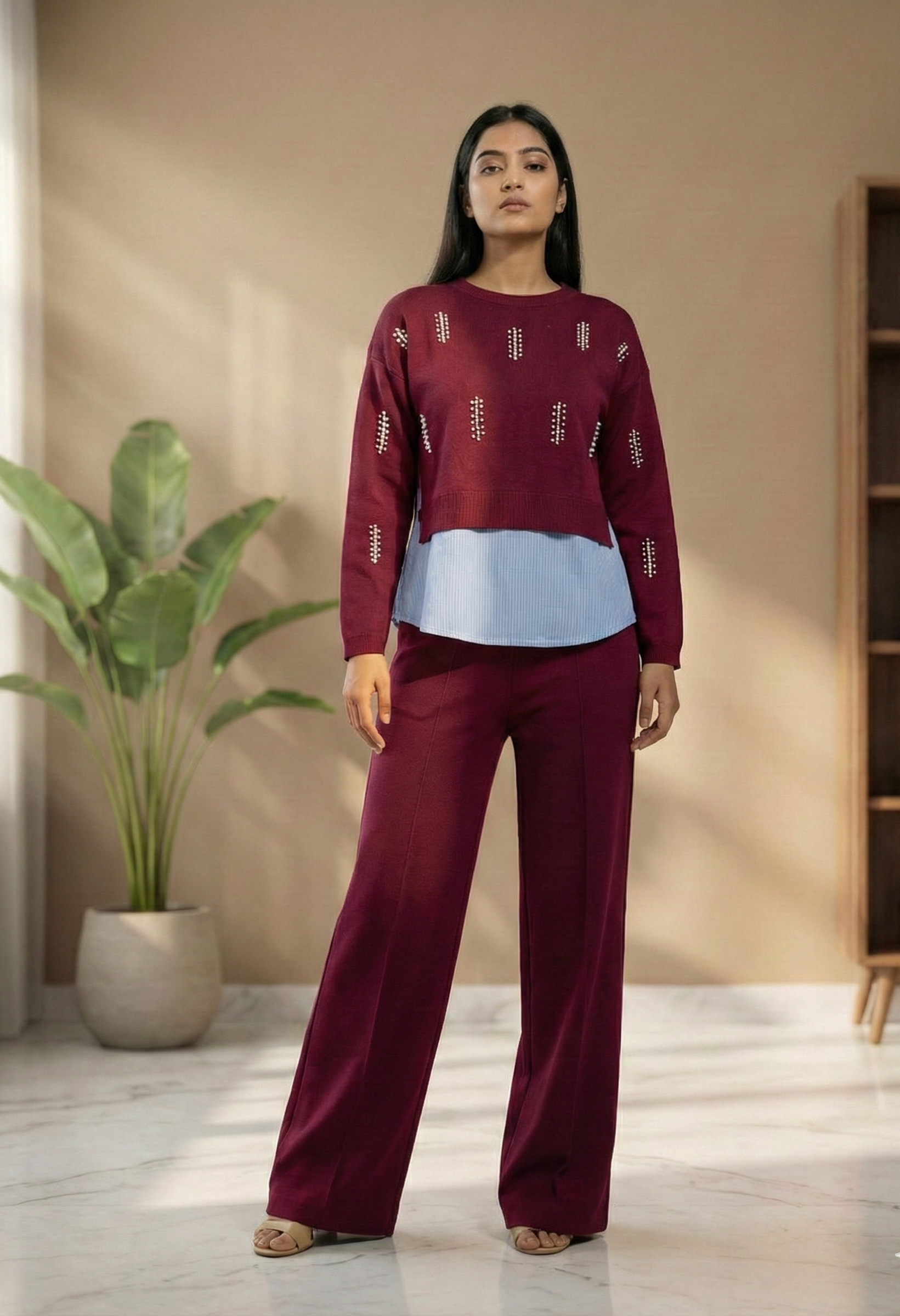 Step into effortless elegance with this stunning embellished layered coord set. Designed for women who love comfort without compromising on style, this two-piece ensemble features a beautifully crafted layered top highlighted with refined embellishment detailing. Paired with relaxed wide-leg trousers, the set offers a sleek silhouette perfect for workwear, outings, brunch, travel, and everyday chic dressing. Soft, breathable fabric ensures premium comfort, making this coord a must-have for your modern wardrobe.