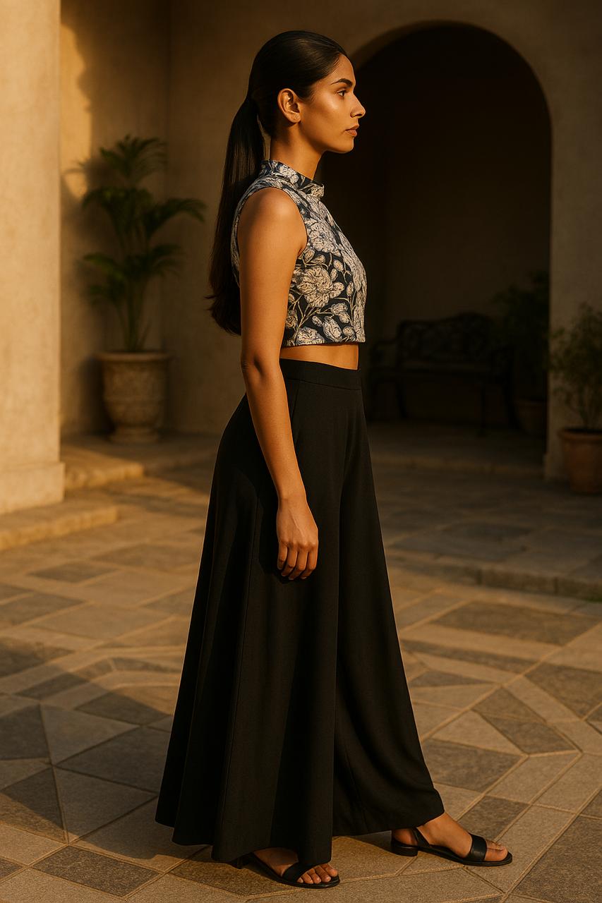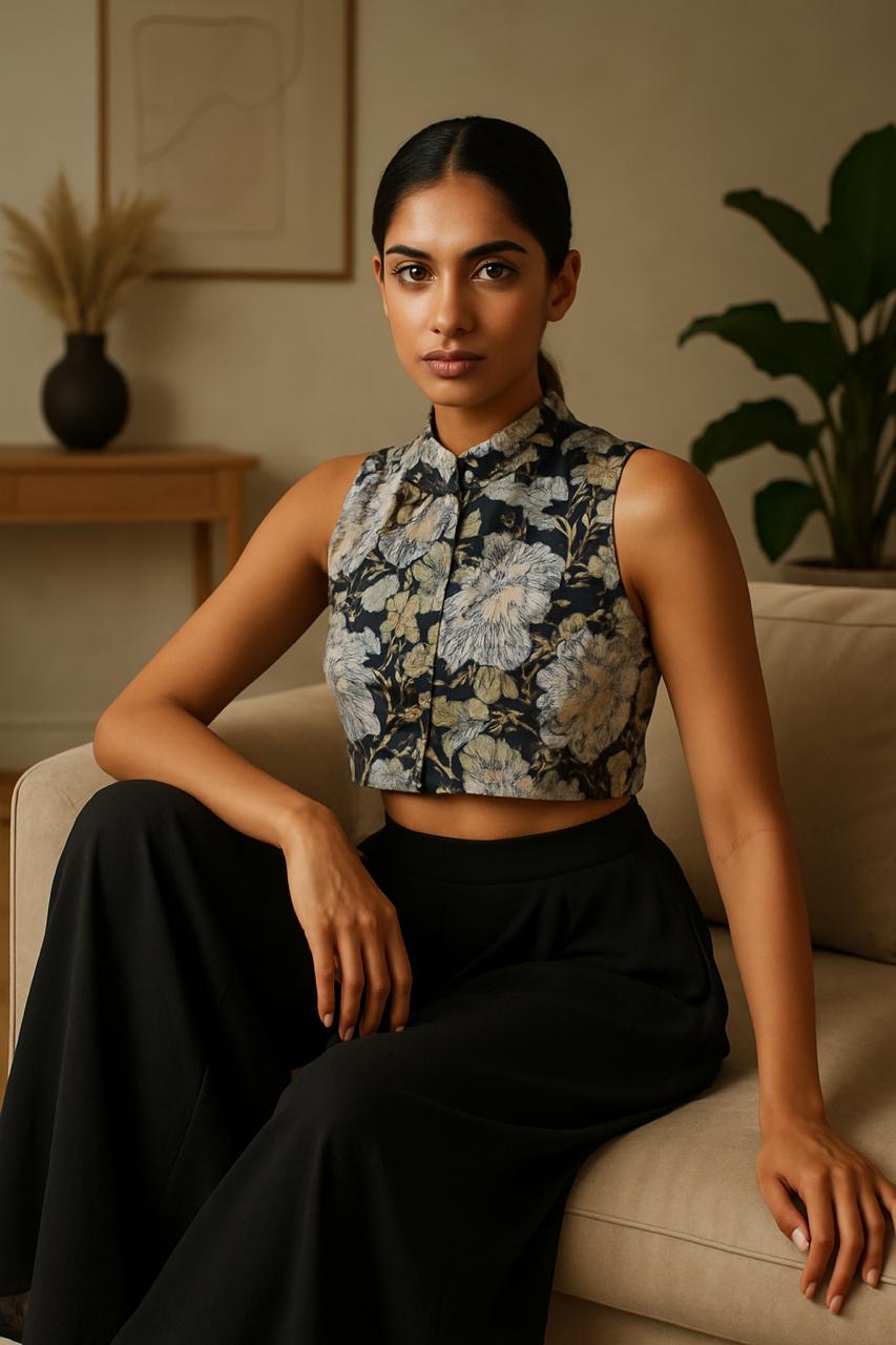 Elevate your style with our Midnight Flora Top, a statement piece crafted for modern sophistication. Designed with a sleek high-neck silhouette, this sleeveless crop top showcases an intricate golden floral print over deep noir tones—perfectly balancing elegance with bold charm. Whether styled with wide-leg trousers, skirts, or denim, it transitions effortlessly from resort escapes to evening soirees, making it a versatile must-have in your wardrobe.