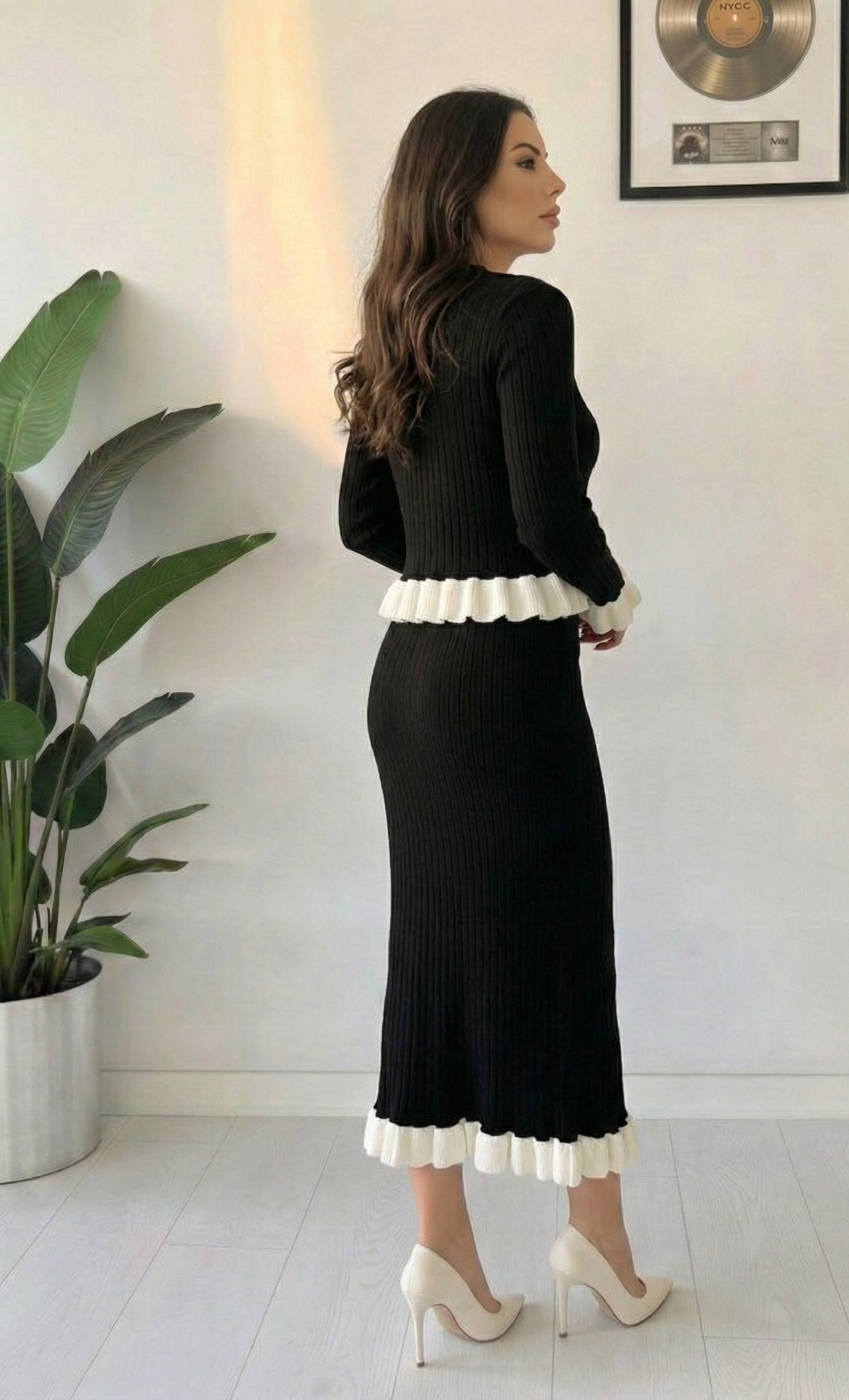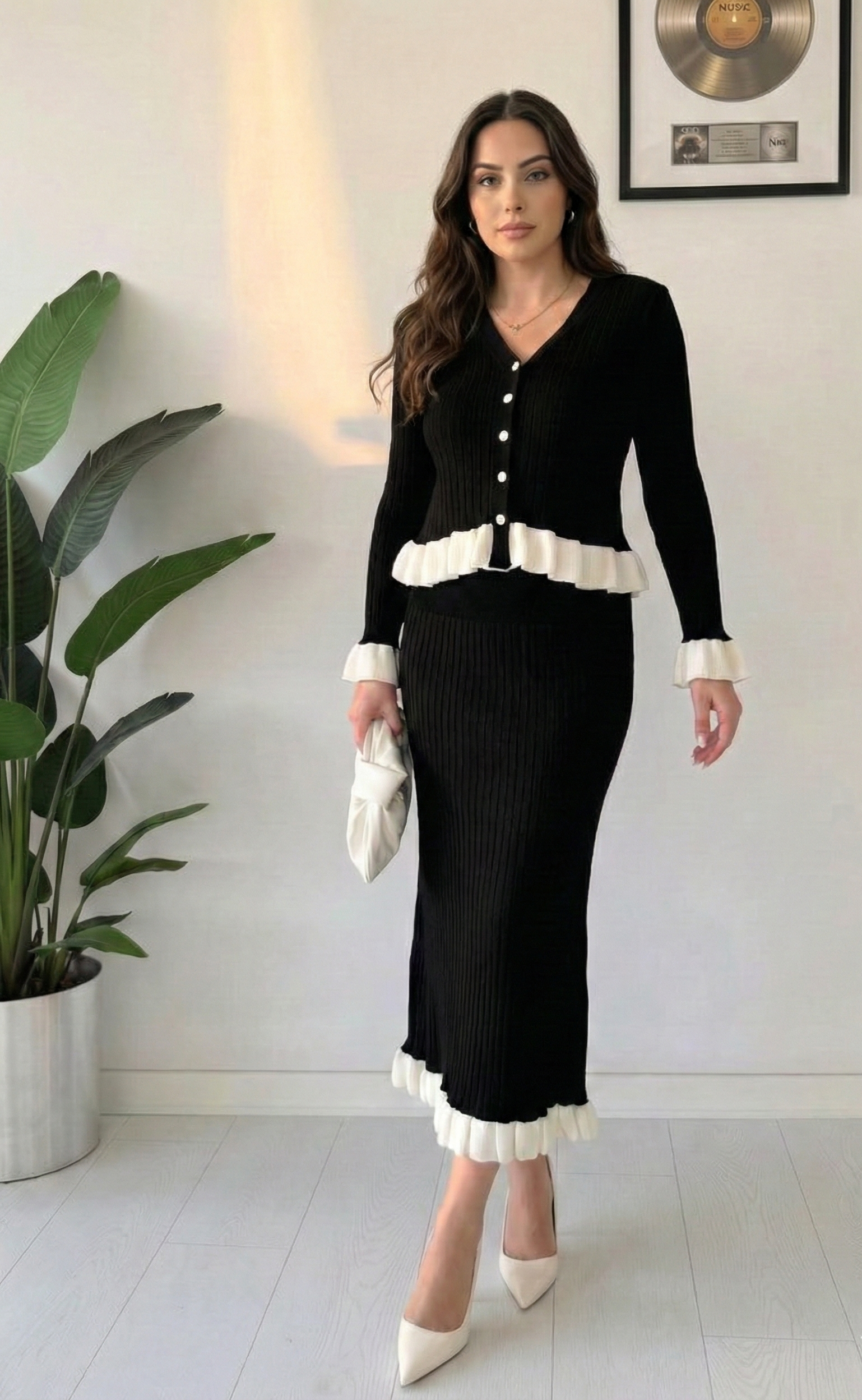 Step into refined sophistication with the Midnight Ruffle Elegance Ribbed Co-ord Dress Set, designed for women who appreciate classic style with a modern twist. This premium rib-knit outfit features a fitted V-neck cardigan-style top adorned with pearl buttons and delicate contrast ruffle trims on the hem and sleeves. The matching long ribbed skirt enhances your silhouette while offering comfort and graceful movement. Whether you’re dressing for brunch, office events, dinner nights, or classy outings, this co-ord set delivers effortless elegance. Its timeless black-and-ivory palette, combined with the structured ribbed texture, makes it a must-have staple for elevated everyday wear.