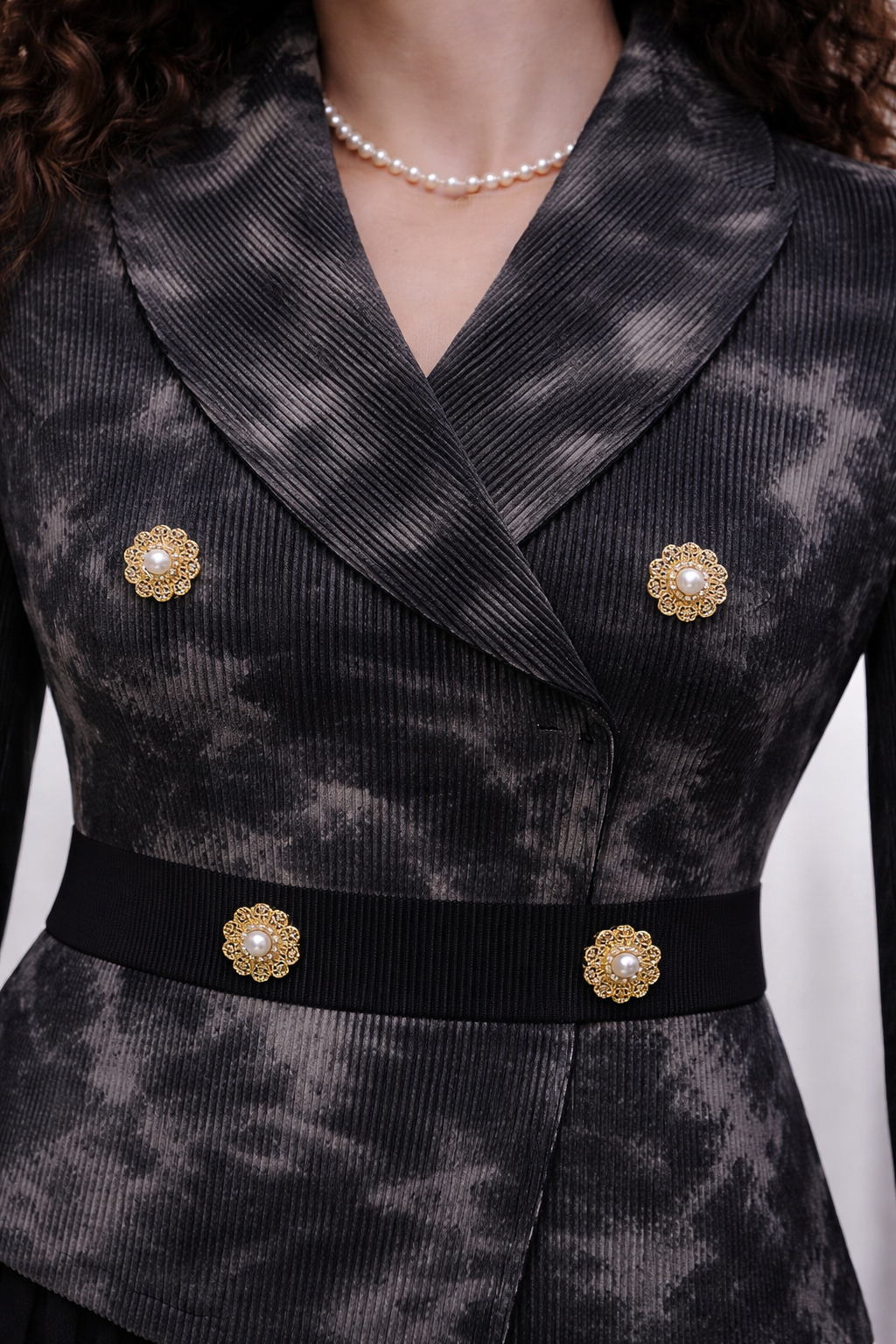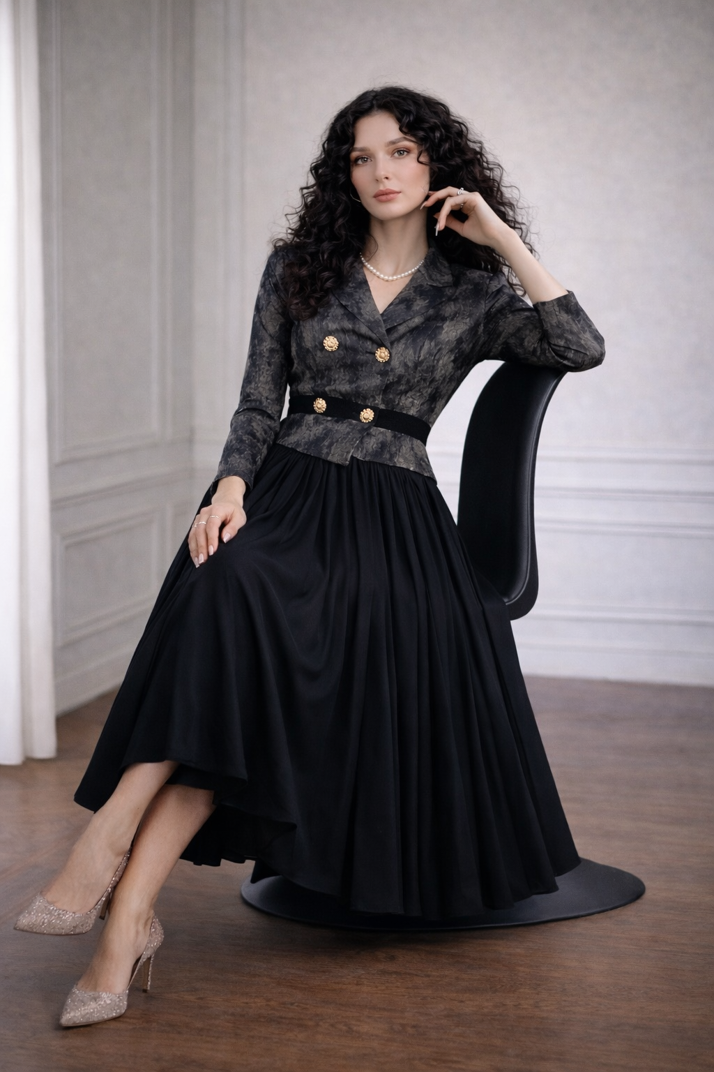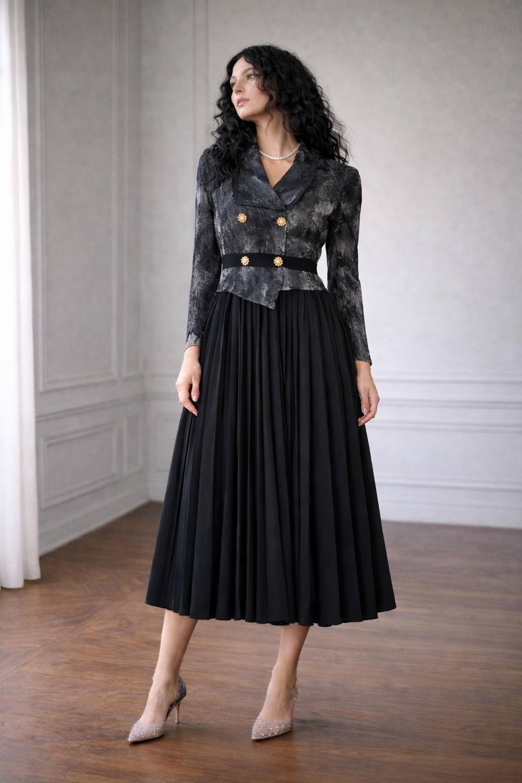 The soft, stretchable fabric comfortably fits up to size XXL, adapting to your body for a perfect fit. The classic collared neckline with statement button detailing adds a refined touch, while the pleated flare skirt creates a graceful and feminine silhouette.