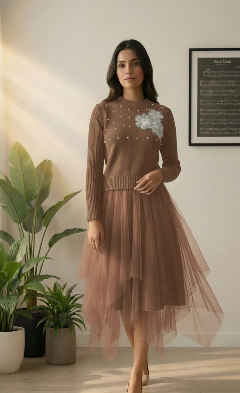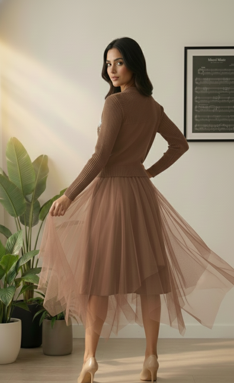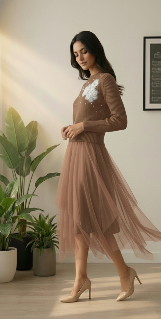 Step into refined elegance with this stunning layered mesh dress paired with a beautifully embellished vest. Designed for women who love dreamy silhouettes and subtle luxury, this outfit blends soft textures with intricate detailing.
