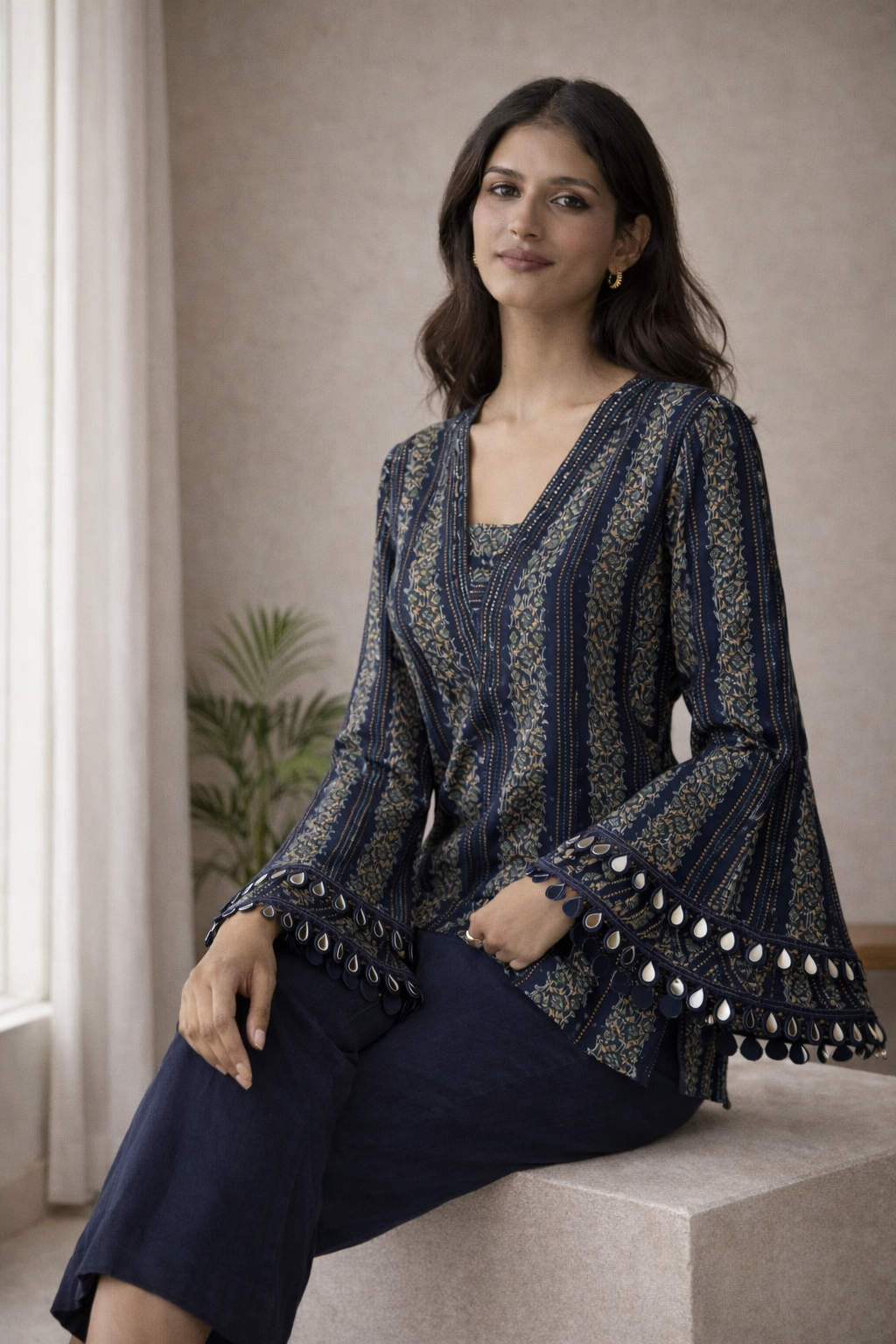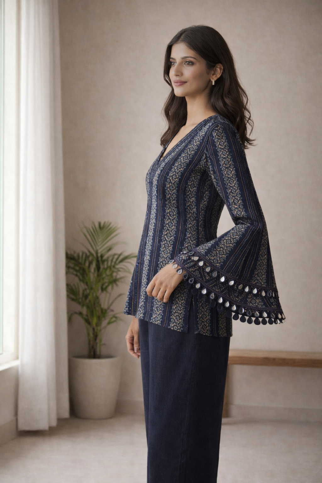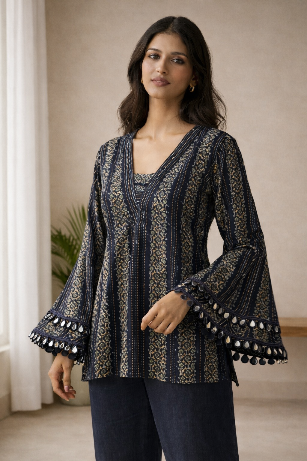 The kurti is designed with a flattering V-shaped neckline that enhances the silhouette while maintaining a clean and graceful finish. The statement bell sleeves add a contemporary touch, finished with delicate mirror lace detailing along the hem that brings subtle festive charm without being overpowering.