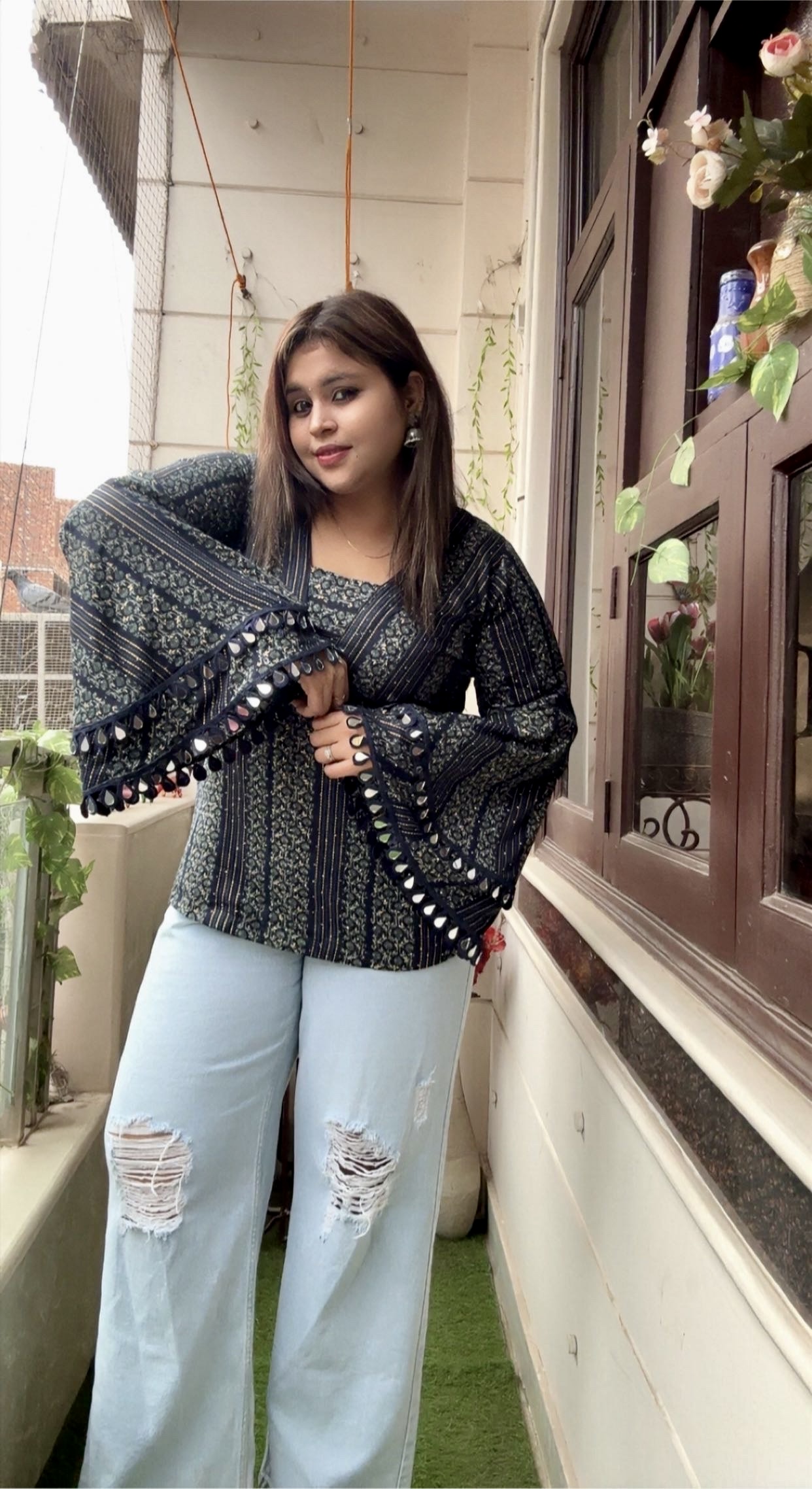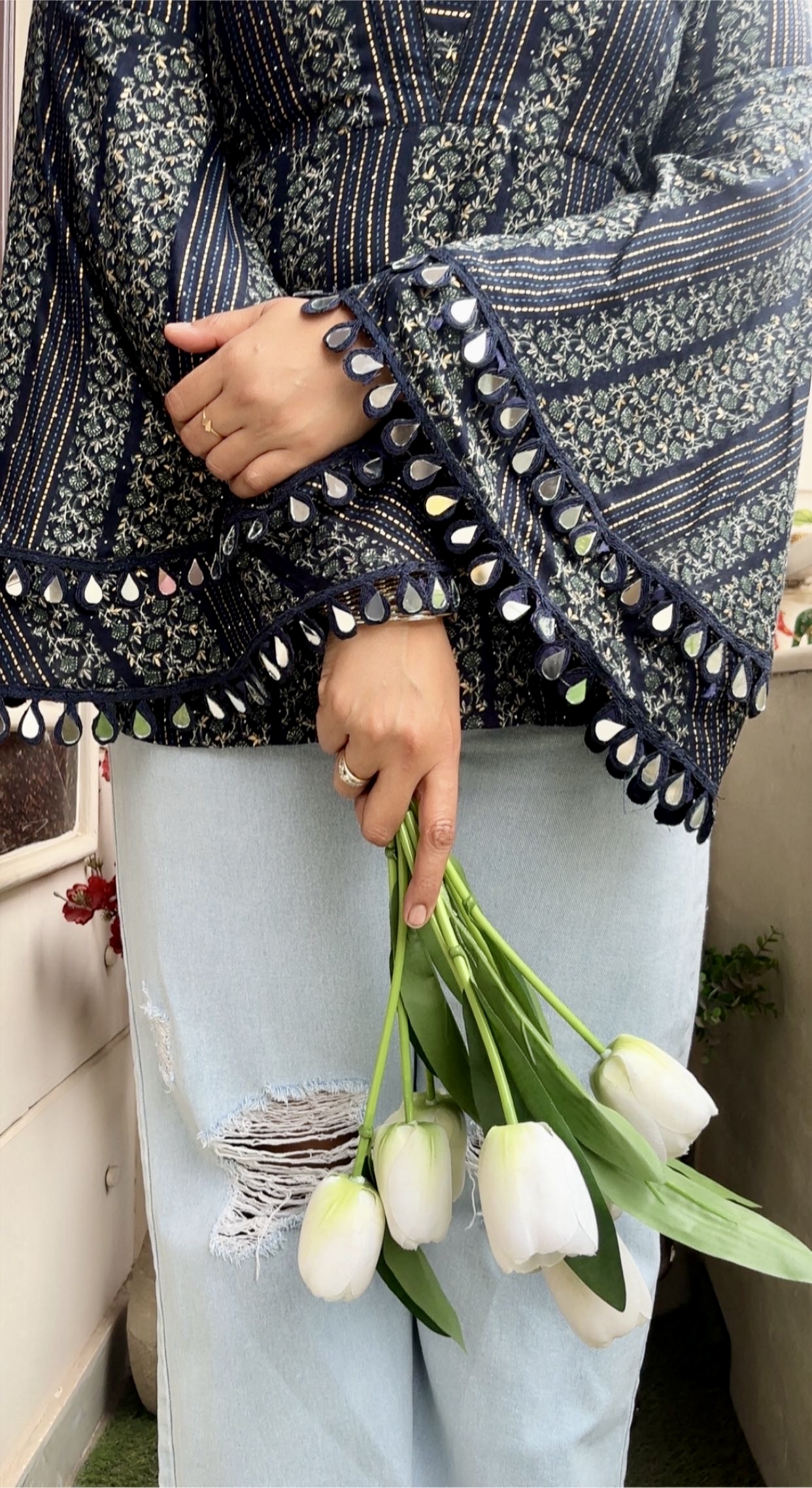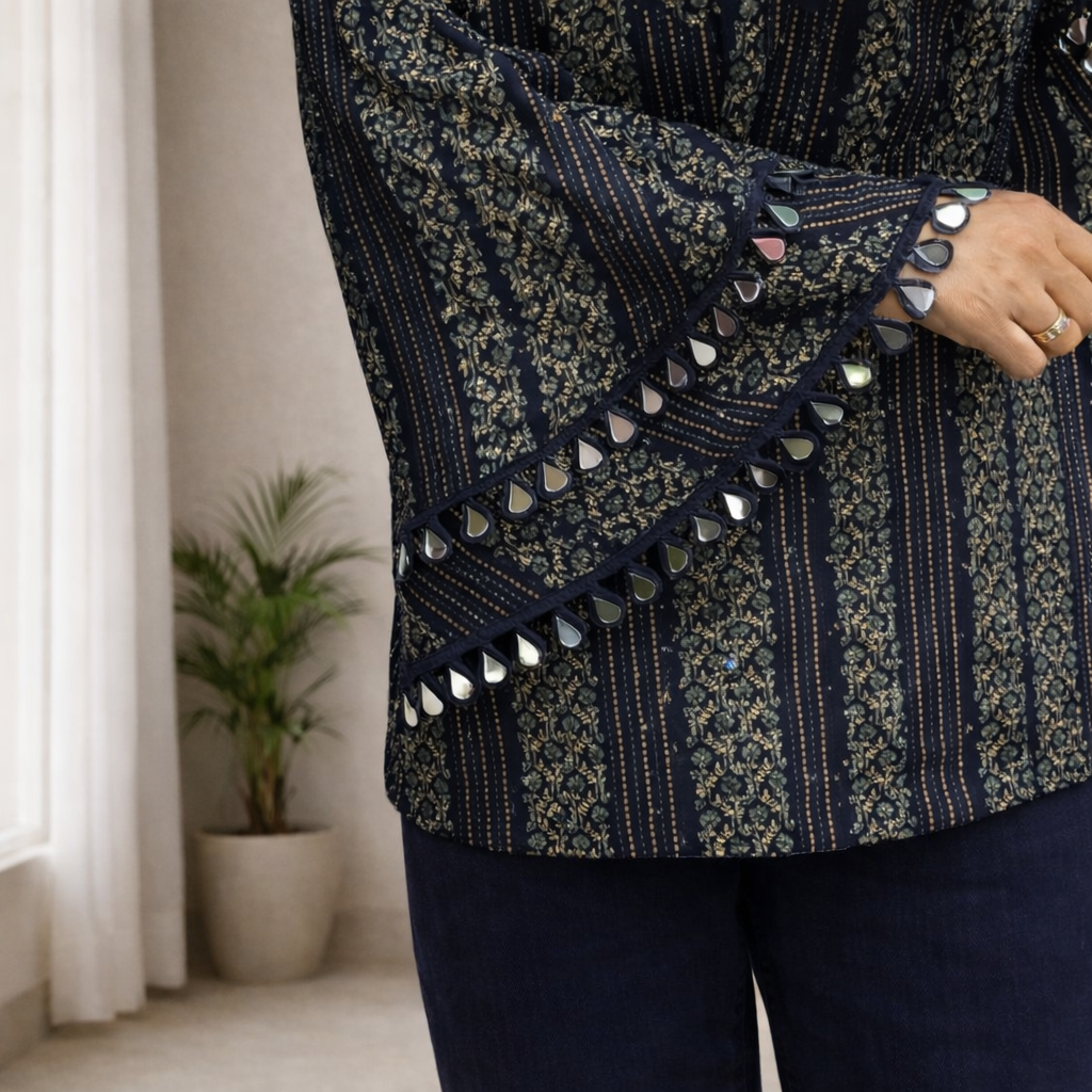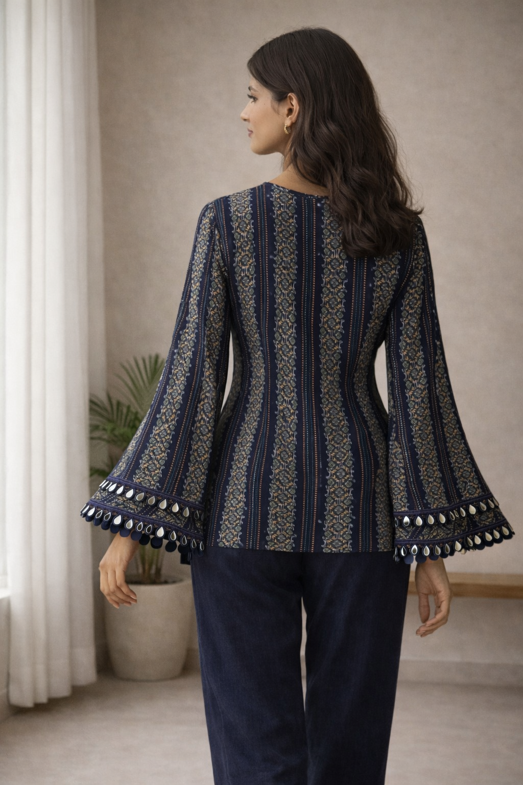 The kurti is designed with a flattering V-shaped neckline that enhances the silhouette while maintaining a clean and graceful finish. The statement bell sleeves add a contemporary touch, finished with delicate mirror lace detailing along the hem that brings subtle festive charm without being overpowering.