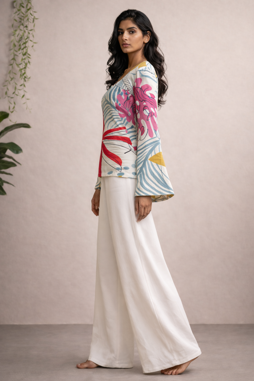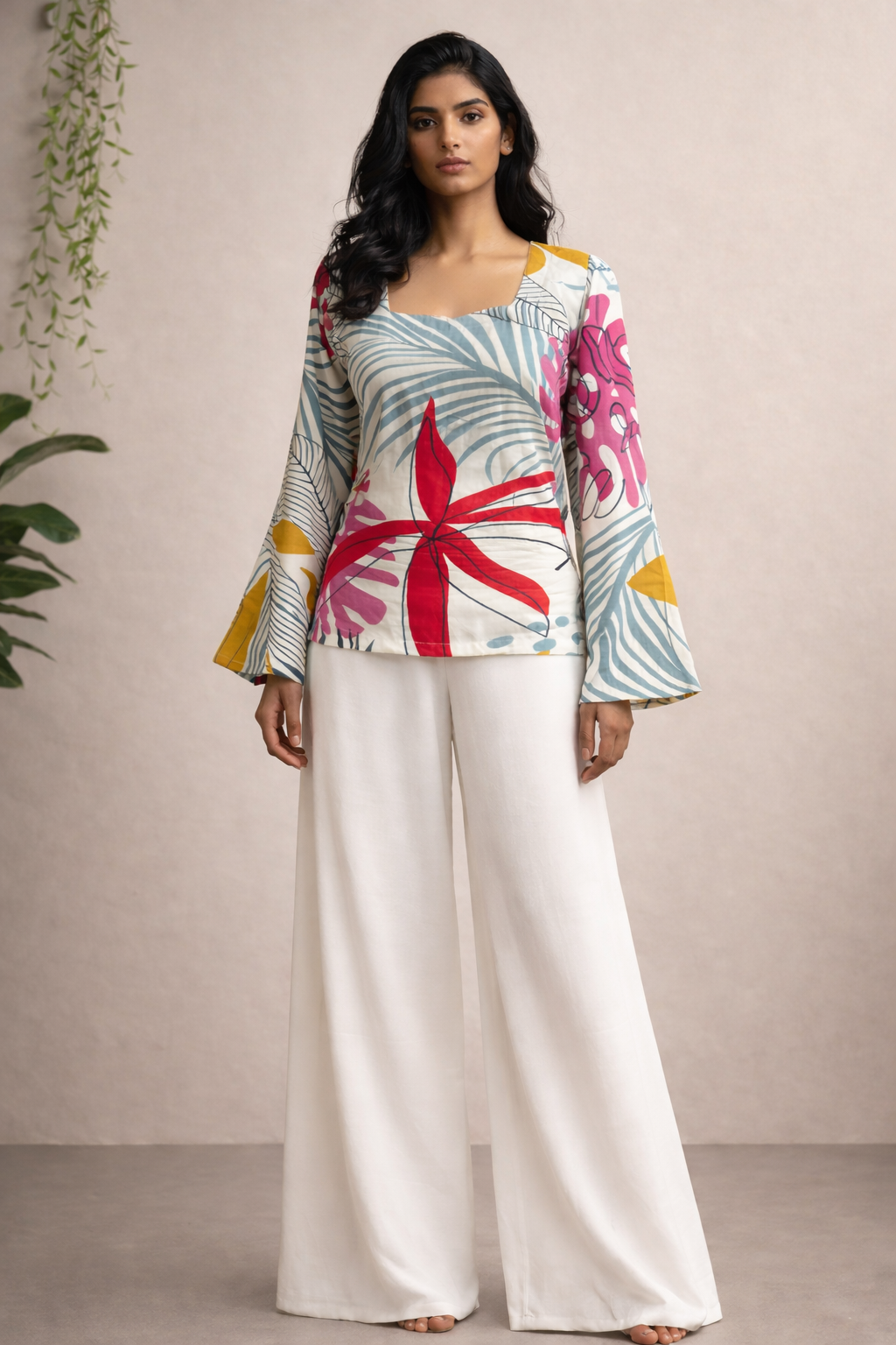 Style it with trousers, palazzos, or even denim for a versatile, chic ensemble.