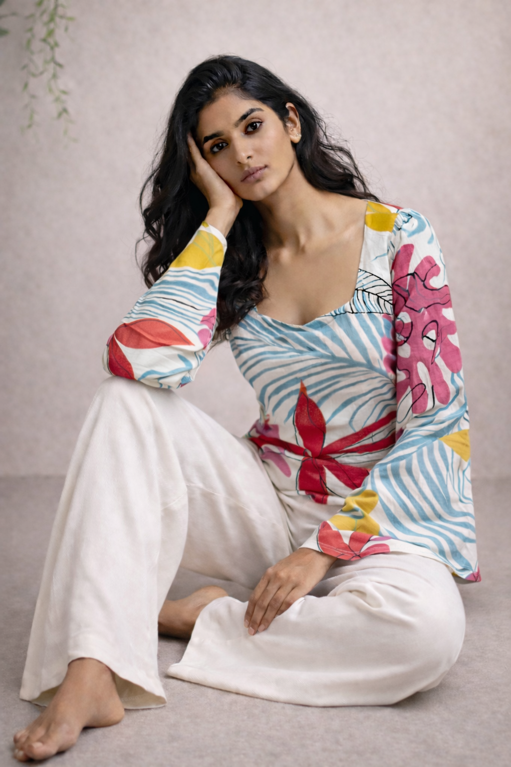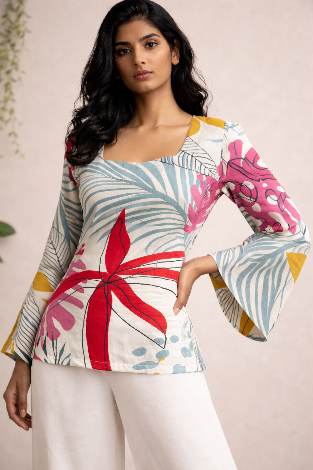 Adorned with vibrant floral and abstract prints, it brings a refreshing, contemporary twist to ethnic wear. The delicate neckline and flared sleeves enhance its graceful appeal, making it perfect for both casual outings and elevated day looks.