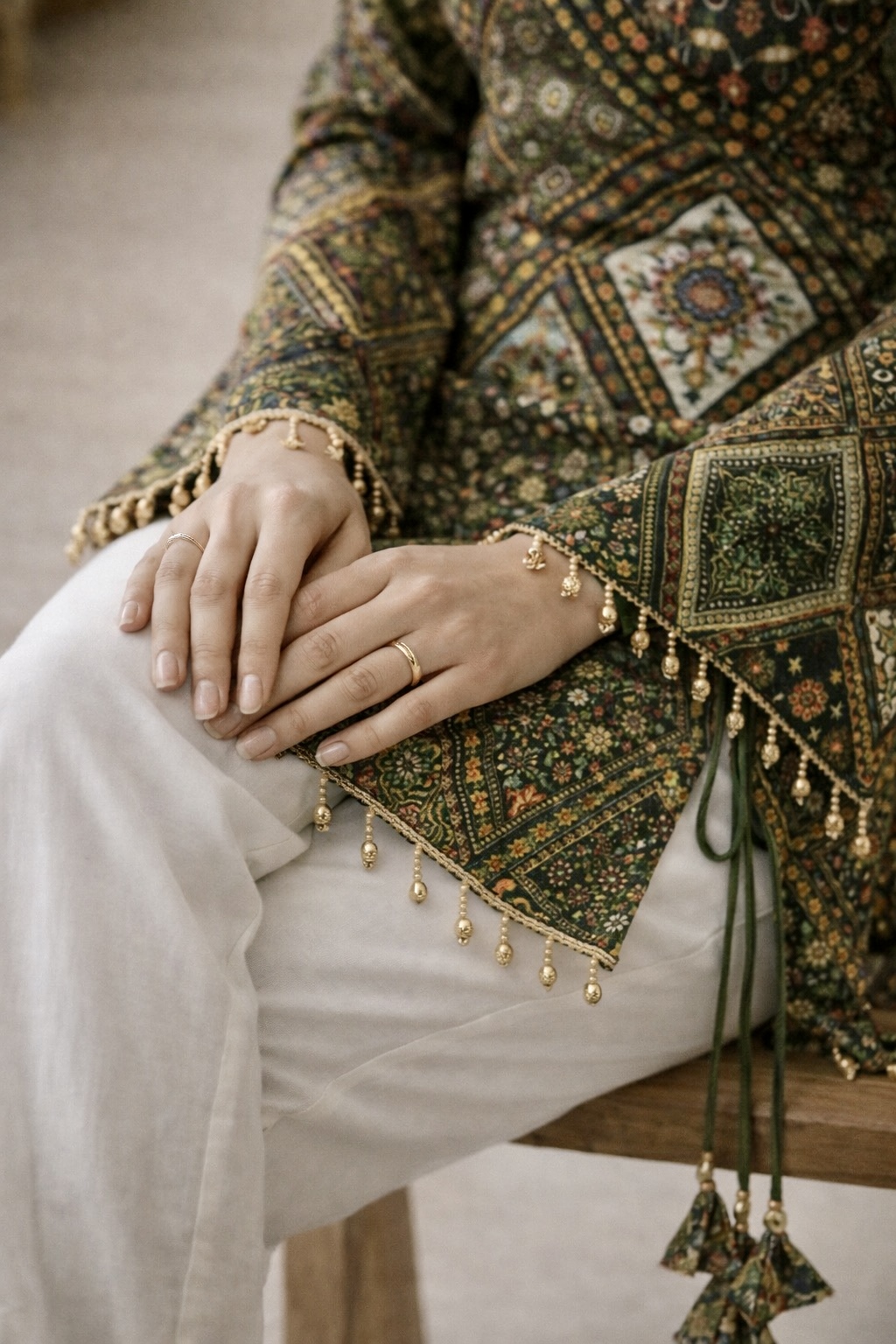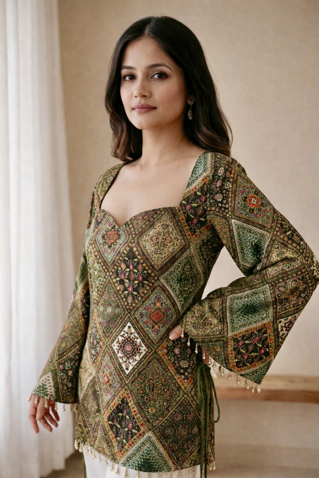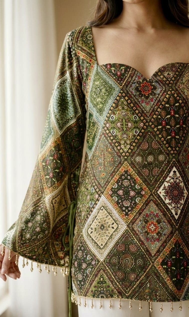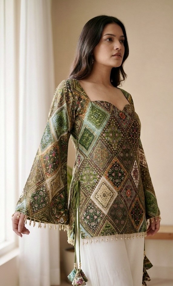 A perfect blend of elegance and individuality, this designer kurti is crafted to make a subtle yet striking statement. The flared long sleeves add graceful movement, creating a silhouette that feels both modern and effortlessly stylish.