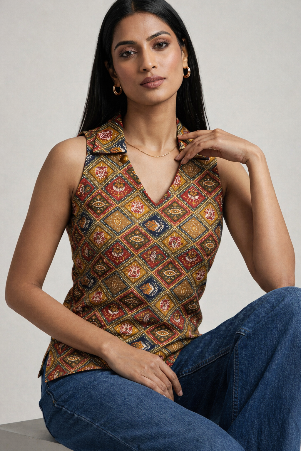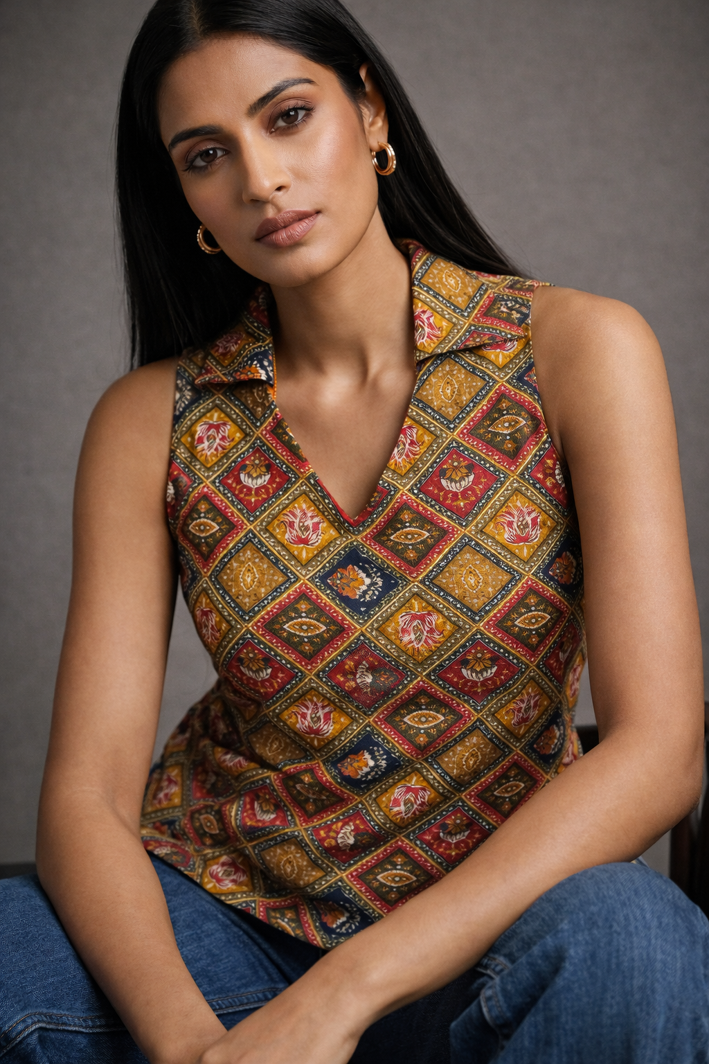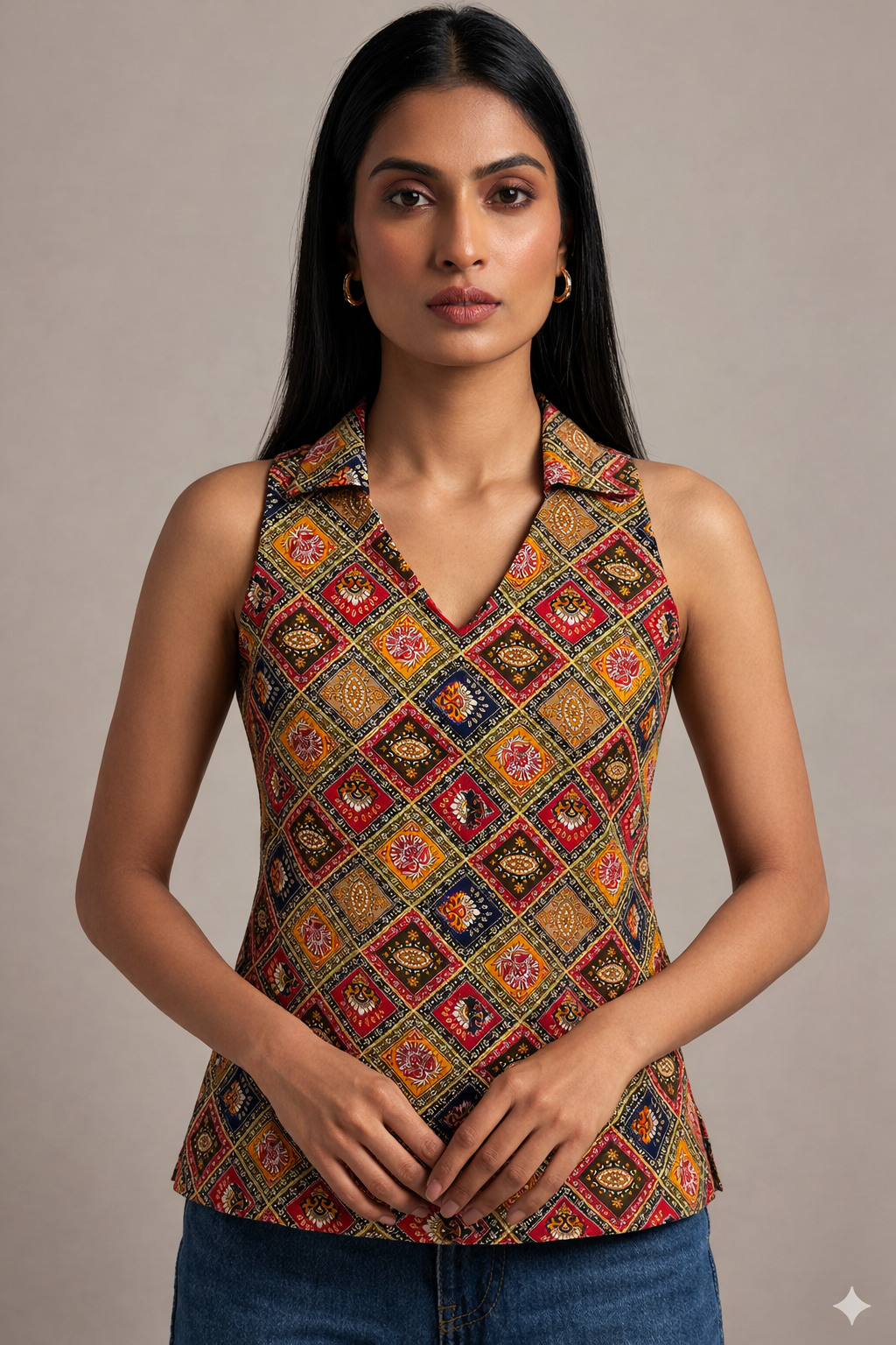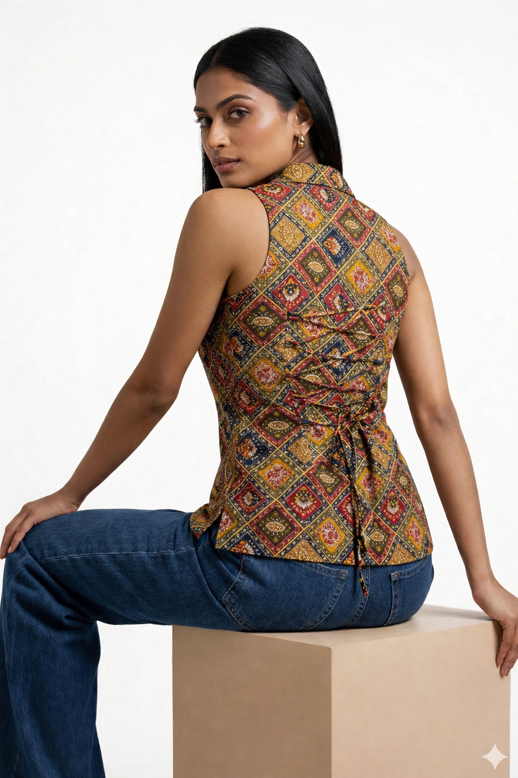 The Rangrez Corset Kurti is a bold celebration of color, craft, and contemporary tailoring. Featuring a vibrant diamond-inspired multi-colour print, this sleeveless kurti is designed with a flattering corset-style fit that gently shapes the waist while keeping the look effortlessly elegant.